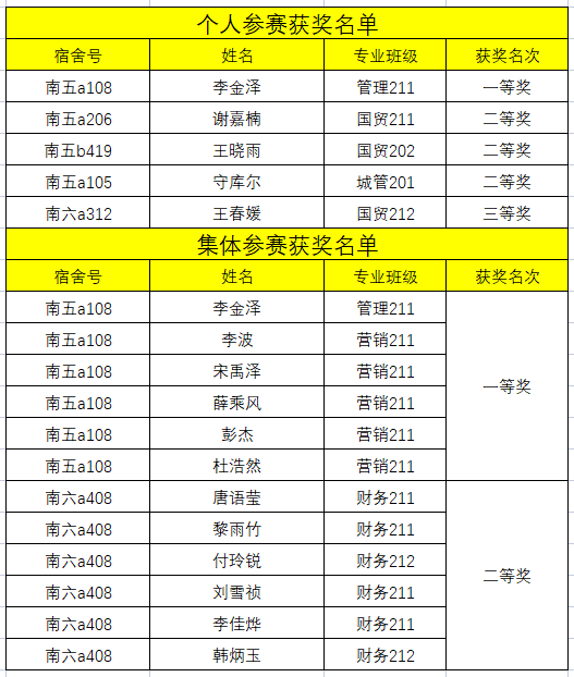 在个人赛中,管理211班学生李金泽获得一等奖,国贸211班谢嘉楠、国贸202班王晓雨、城管201班守库尔获二等奖,国贸212班王春媛获得三等奖;在集体赛中,南五A108宿舍六名同学获得集体一等奖,南六A408六名同学获得集体二等奖。