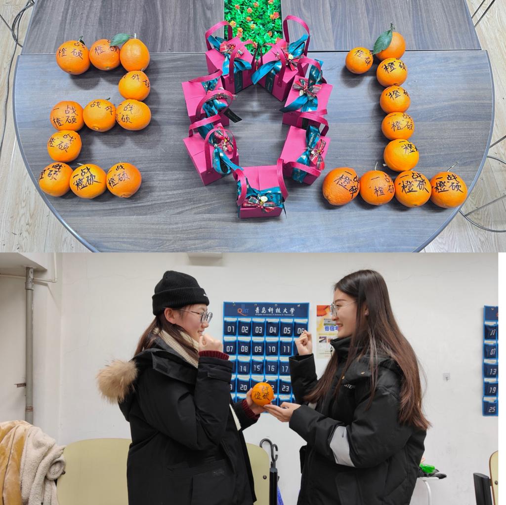 辅导员为考研的学生挑选了具有马到“橙”功、“苹”安顺利美好寓意的橙子和苹果,将祝福放入吉祥如意的红色纸袋中组成一个个凝结学院爱心的幸运福袋。