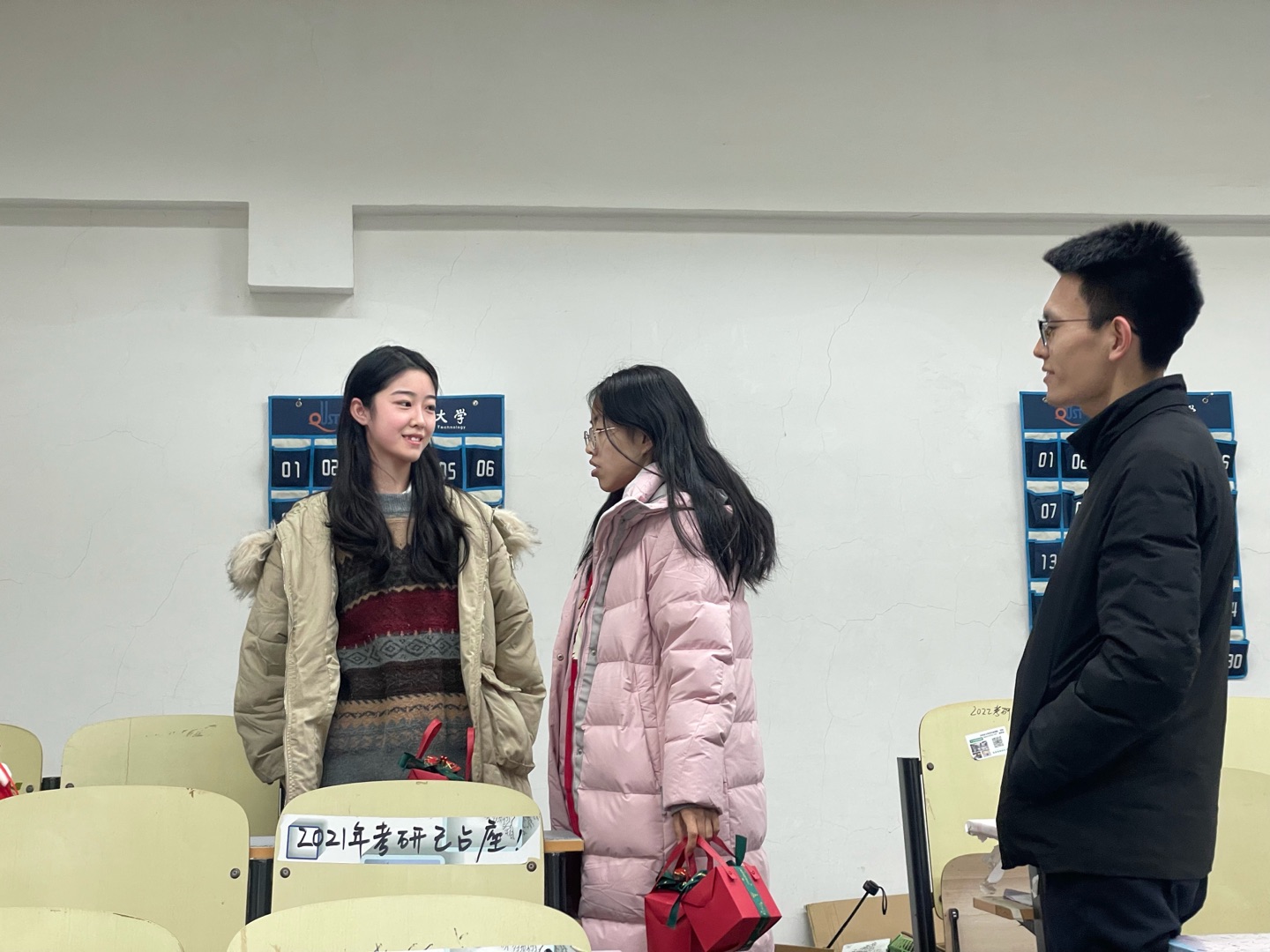 “气温降低要做好防寒保暖“”宿舍要注意通风换气,保持空气流通“”明天就要考试了,注意身体,劳逸结合”......12月24日,2018级辅导员张晓帆、张显全去到教室和学生宿舍为考研学子加油打气,缓解考研学子紧张情绪,鼓励学生坚定信心,同时为全体考研学子送上了精心准备的小礼物,预祝学生金榜题名。