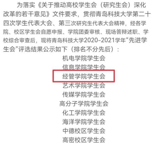2020-2021学年“先进学生会”荣誉的评选中,我院学生会再度荣获学校2020-2021学年“先进学生会”称号。