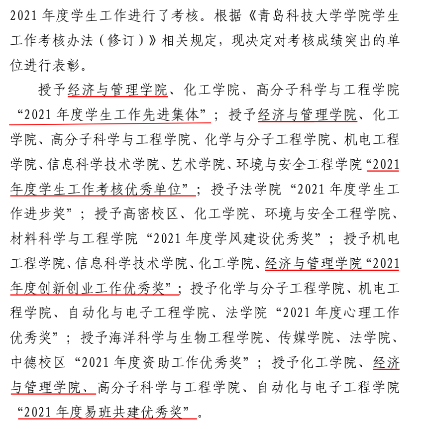2021年度学生工作考核结果公布,经学校评价、学院互评和学生评价等环节,我院学生工作再度蝉联全校第一名(连续四年),我院荣获“2021 年度学生工作考核优秀单位”,我院学工队伍获评“2021 年度学生工作先进集体”,同时荣获“2021年度创新创业工作优秀奖”“2021 年度易班共建优秀奖”两个单项奖励。