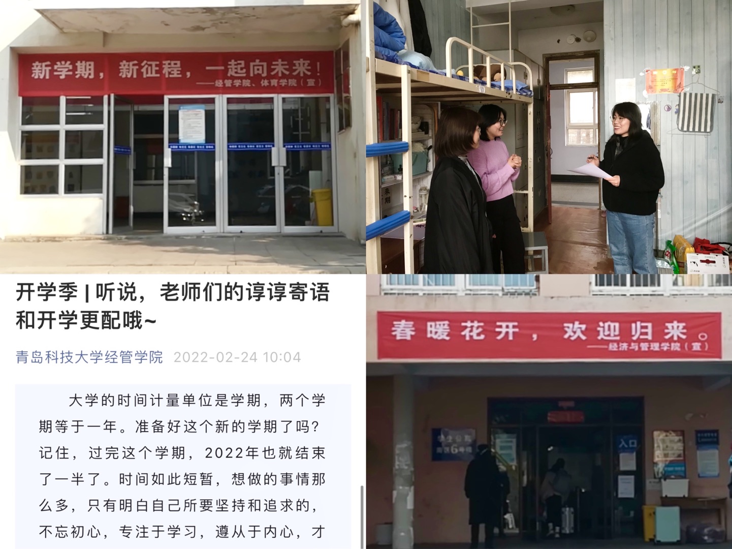 学院依托“四个到位”,暖心护航让开学季有情怀有温度:“心理动态关注到位”,学工队伍第一时间开展“一对一”返校服务工作,针对夜间返校学生、因疫情暂缓返校学生、学业困难、家庭困难等不同类型学生开展深入交流,积极做好心理关注与疏导,确保学生安全稳定;“场景育人氛围到位”,充分发挥校园场景的文化育人效能,在经管楼、宿舍楼门口、宿舍楼道等区域悬挂横幅并张贴开学标签,送上新学期的祝福,带给学生满满的归属感;“指导帮扶跟进到位”,组织教师为学生送上开学“锦囊妙计”与新学期暖心寄语,引导全体学子迎战新学期、积极向未来;“服务关怀暖心到位”,院领导、全体辅导员深入学生宿舍,了解返校学生的生活学习现状,持续做好学生返校后的人文关怀与呵护。正如2021级学生于辰洋所说,“返校旅途虽然辛苦,但是进入校园后看到热情迎接我们的老师、精心布置的校园场景与及时组织的核酸检测,让我们内心感到无比的踏实、温暖与感恩”。