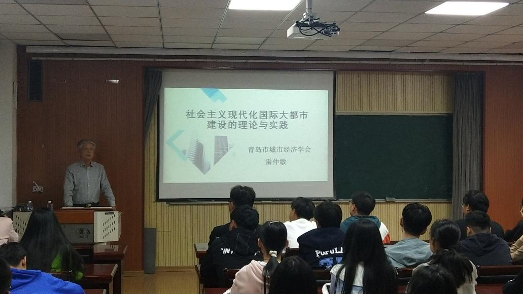 近日,青岛市第十三次党代会刚刚落下帷幕,此次党代会绘就了青岛市未来五年的美好发展蓝图,开启了建设新时代社会主义现代化国际大都市的新征程。青岛现在正进入“两会时间”, 春光明媚,万物竞发,催人奋进。为更好地贯彻落实党代会思想,引导城管专业广大同学将所学专业知识和社会发展实践紧密结合,进一步认识建设现代化国际大都市的重要战略意义,4月18日,城市管理专业特邀请青岛市城市经济学会会长雷仲敏教授作了主题为“社会主义现代化国际大都市建设的理论与实践”的专题讲座,讲座由城管系主任万婕老师主持。