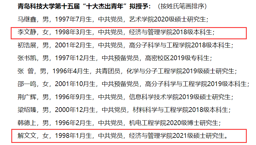 “十大杰出青年”评选办法》(青科大党字〔2008〕12号)的精神要求,经各单位推荐,评选活动组委会相关部门和团委委员评选,我院2021级研究生解文文、2018级本科生李文静荣获成人直播平台