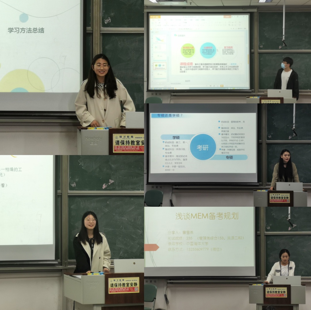 随后,学长学姐向在座同学做了自我介绍,并结合自身经验,与同学们面对面交流,并给出相应建议。曹雪燕(中国海洋大学)、王丽娜(河海大学)分别就考研时间安排、学校选择、参考资料获取、复试准备方面分享了自己的成功经验,并向同学们寄予希望;张亚奇(日日顺)、贾俊荣(顺丰)分别就找工作渠道、面试技巧、简历填写等方面讲述了自己成功的经验以及途中遇到的问题,帮助大家认清自己各种招聘的优劣势,选择最适合自己的就业方向;彭承琪(保研暨南大学)主要分享了自己保研的整个心路历程,并为大家推荐了非常实用的软件工具,同时鼓励同学们积极做好规划,不要盲目相信机构,自己才是最棒的那颗星。
