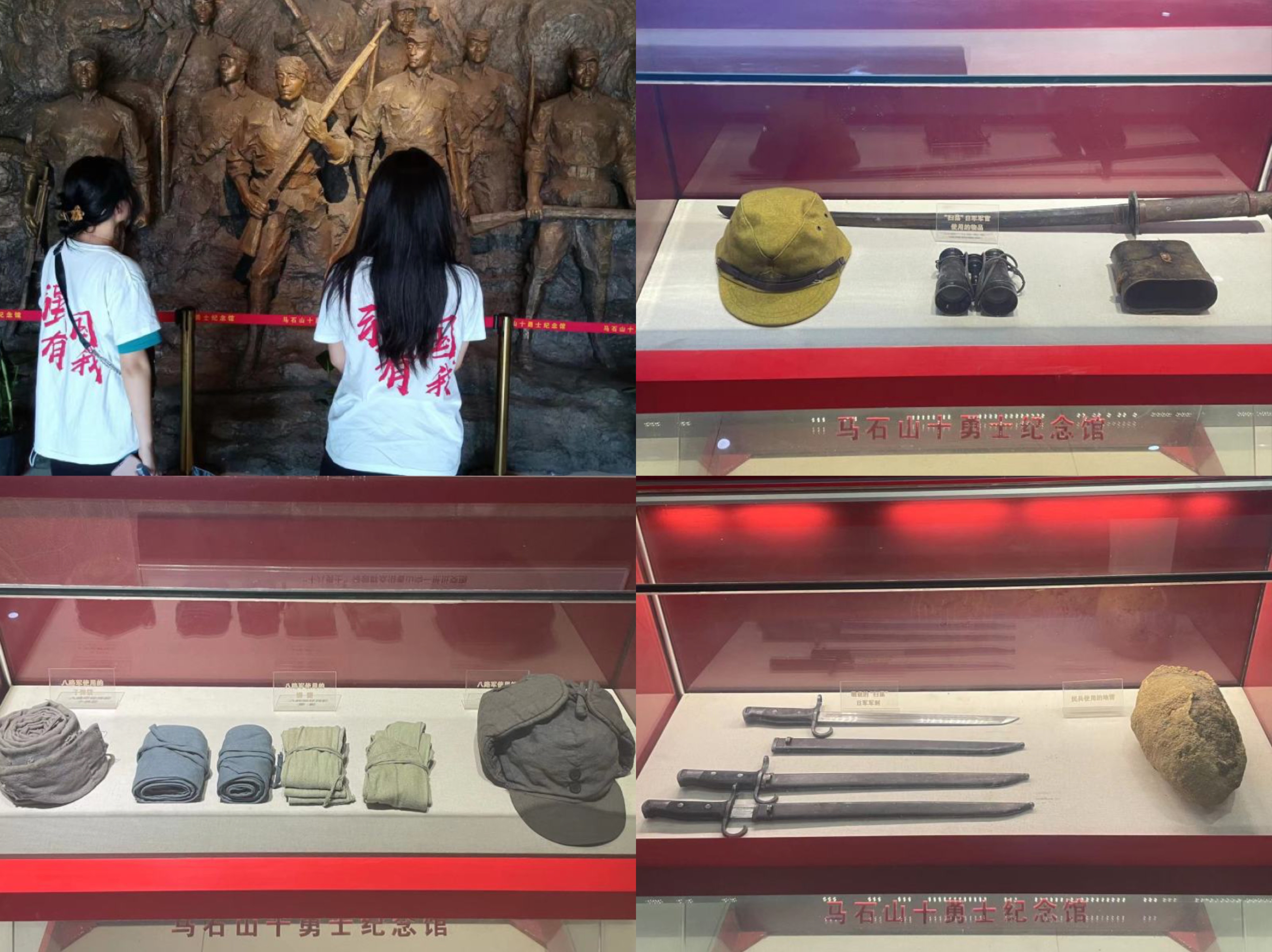 接下来,同学们进入馆内更深一步的了解马石山反“扫荡”突围战。进入馆内,映入眼帘的是马石山十勇士的雕像,每名勇士的脸上反映的无一不是保卫人民的决心与不畏危险、慷慨赴死的坚定。馆内的墙上讲述的历史吸引了学生们,他们驻足研读,仿佛身临其境,感受到这场突围战的惨烈,感受到侵略者的凶残。墙边的展柜里是当时留下来的物件,包括在战斗遗址发现的子弹,缴获的日军物资,八路军使用的子弹袋、绑腿,民兵使用的地雷和日军军刺等等。在亲眼见到这些几十年前的物件时,学生们真正理解了历史课本中的那句“敌我力量悬殊”的含义,这是在亲眼见证战争的艰难和八路军战士们的勇敢坚持之后的理解,是中华民族伟大复兴的使命的传承,是从先辈肩上接过来的吾辈当自强的责任。