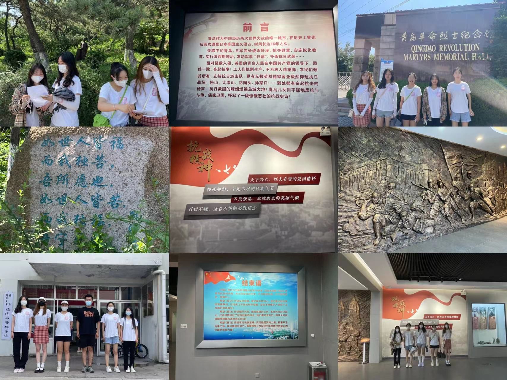 七月八日,社会实践成员前往青岛革命烈士纪念馆进行参观学习。“山河魂”烈士群雕坐落于纪念馆中坪广场正中央,烈士群雕以党的一大代表、青岛党组织创建人邓恩铭为原型,周围并肩站立着工人、学生、农民及童工代表,象征着不屈不挠的青岛人民在中国共产党领导下开展的波澜壮阔的革命斗争,同时也喻示着英烈的丰功伟绩与山河共存、与日月同辉。