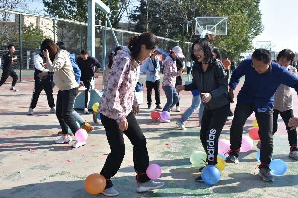 本届趣味运动会项目多样,充满趣味性,设有“踩气球游戏”、“二人三足跑”、“二人跳绳接力”、“投篮比赛”、“背靠背夹求跑”和“拔河比赛”共六个项目。学院老师们积极参与,展现风采,团结合作,共同拼搏。