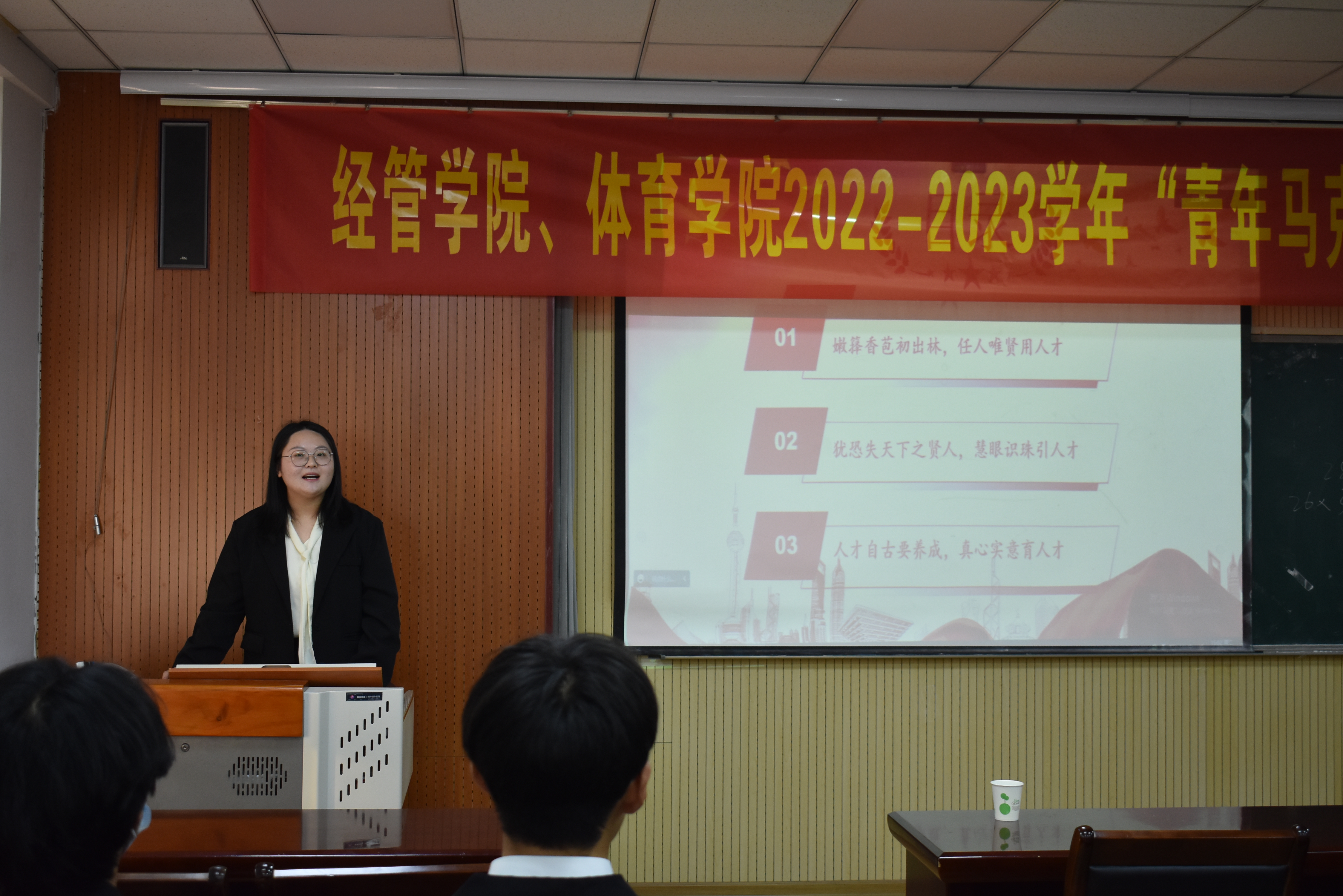 在经管楼419会议室举行2022-2023学年“青年马克思主义者培养工程”培训班开班仪式,团委老师及全体团学骨干与学员代表于线上线下同步参会。