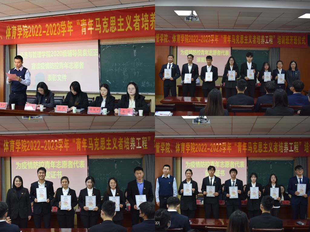 疫情防控青年志愿者表彰文件,并为疫情防控青年志愿者代表颁发证书。“青马工程”学员代表黄安琪上台汇报学习历程并发表倡议,号召各位学员做到学知促行,立志成为具有坚定的马克思主义信仰、全面发展的社会主义合格建设者和可靠接班人。