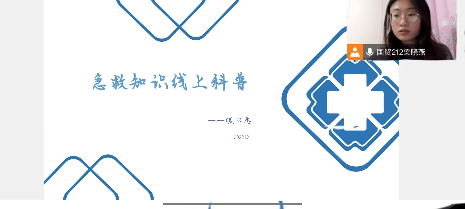 为普及急救医学知识,提高大家自救和救人的能力,暖心愿组织全体成员开展线上急救知识的学习,此次线上普及活动主要涉及四类不同情景下的急救方法,暖心愿会长依次向暖心愿的青年志愿者们进行了讲解,并由志愿者对自己的家人朋友进行讲解普及,以便突发情况能够化险为夷。活动由社团指导老师孙一君和负责人李晓菲共同主持。
