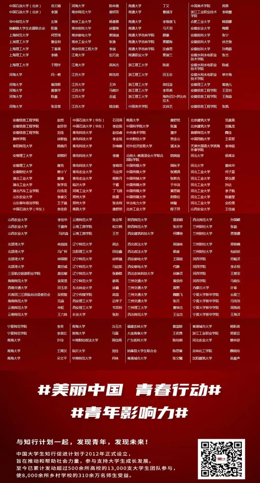 据悉,中国大学生知行计划成立于2012年,旨在推动和帮助社会力量参与支持大学生社会实践和成长发展,鼓励和表彰始终活跃在乡村振兴、助学支教、专业赛事、环境保护、创新创业等各式青年行动一线的高校大学生社团、团队、个人。