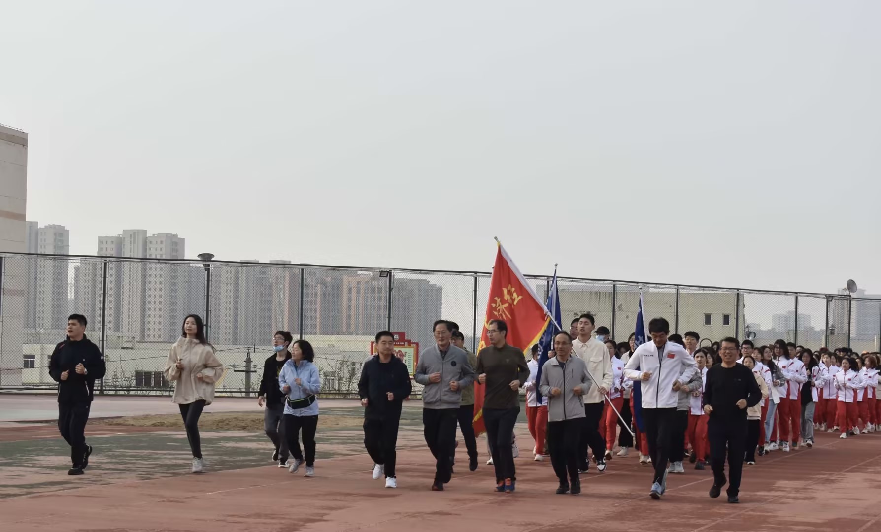 体育综合育人倡议书》。与会领导为21名健康跑标兵颁发荣誉证书。启动仪式后,随着发令枪响,800余名学生身着院服,在“青春的赛道”上奋力奔跑,尽情挥洒汗水、释放青春能量。