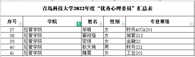 优秀心理委员,分别为:财务ACCA201班邹璐、城管212班翟翊煊 、金融22班密琪、财务221班耿天琪、工业201班魏雪。