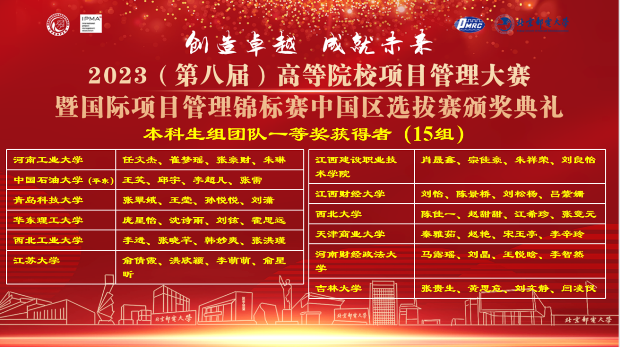2023年6月3日,第八届全国高等院校项目管理大赛在北京邮电大学落下帷幕。大赛由中国优选法统筹法与经济数学研究会、国际项目管理协会(IPMA)主办,北京邮电大学、中国青年项目管理者俱乐部(CYC)承办,上海普华科技发展股份有限公司和西安华鼎项目管理咨询有限责任公司协办。