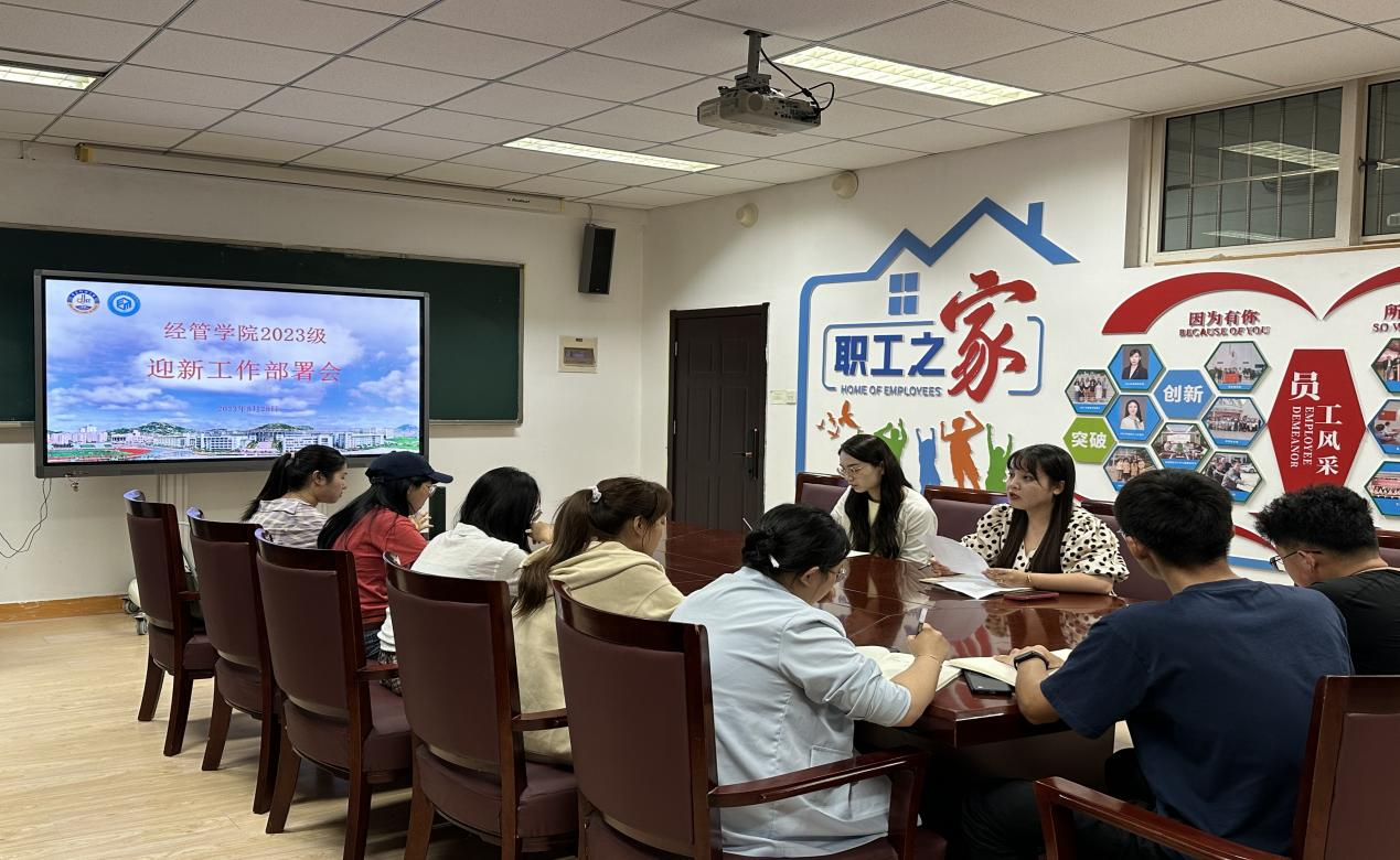 张鸣老师、2023级新生辅导员占晓祎及学生会全体骨干于经管楼415会议室召开2023年迎新筹备会,统筹安排并部署新生迎新具体工作。
