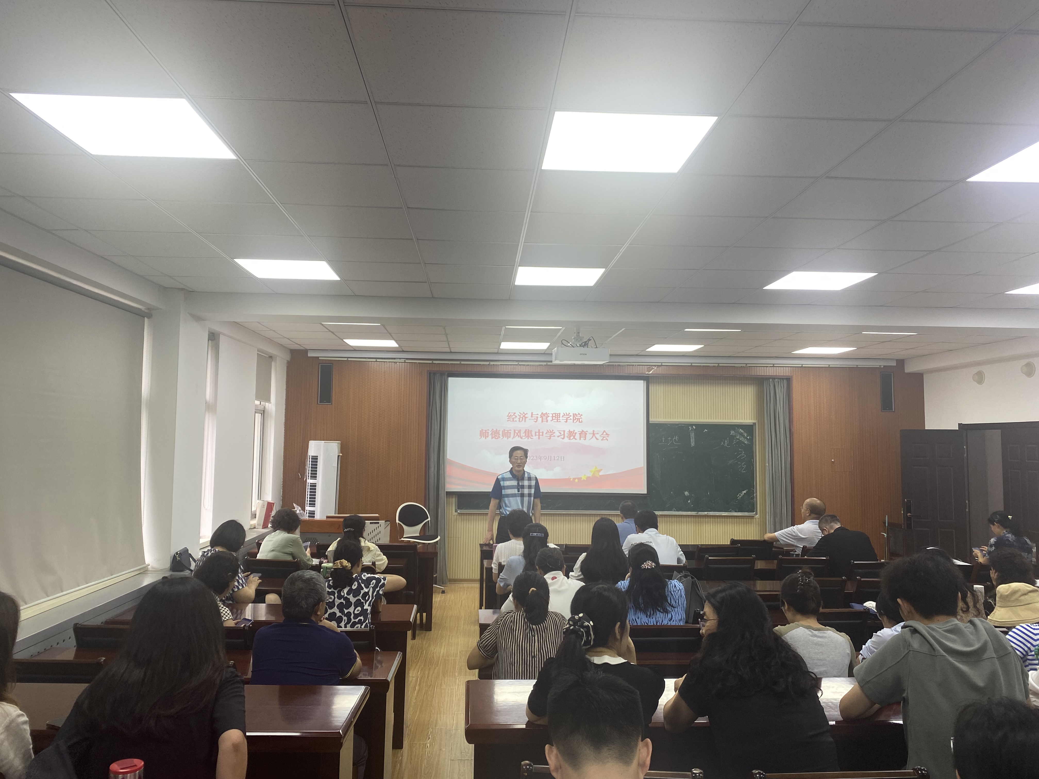 于经管楼410会议室召开师德师风集中学会习教育大会暨全体教职工理论学习会,会议由学院党委书记李德成主持,学院全体教师参加会议。