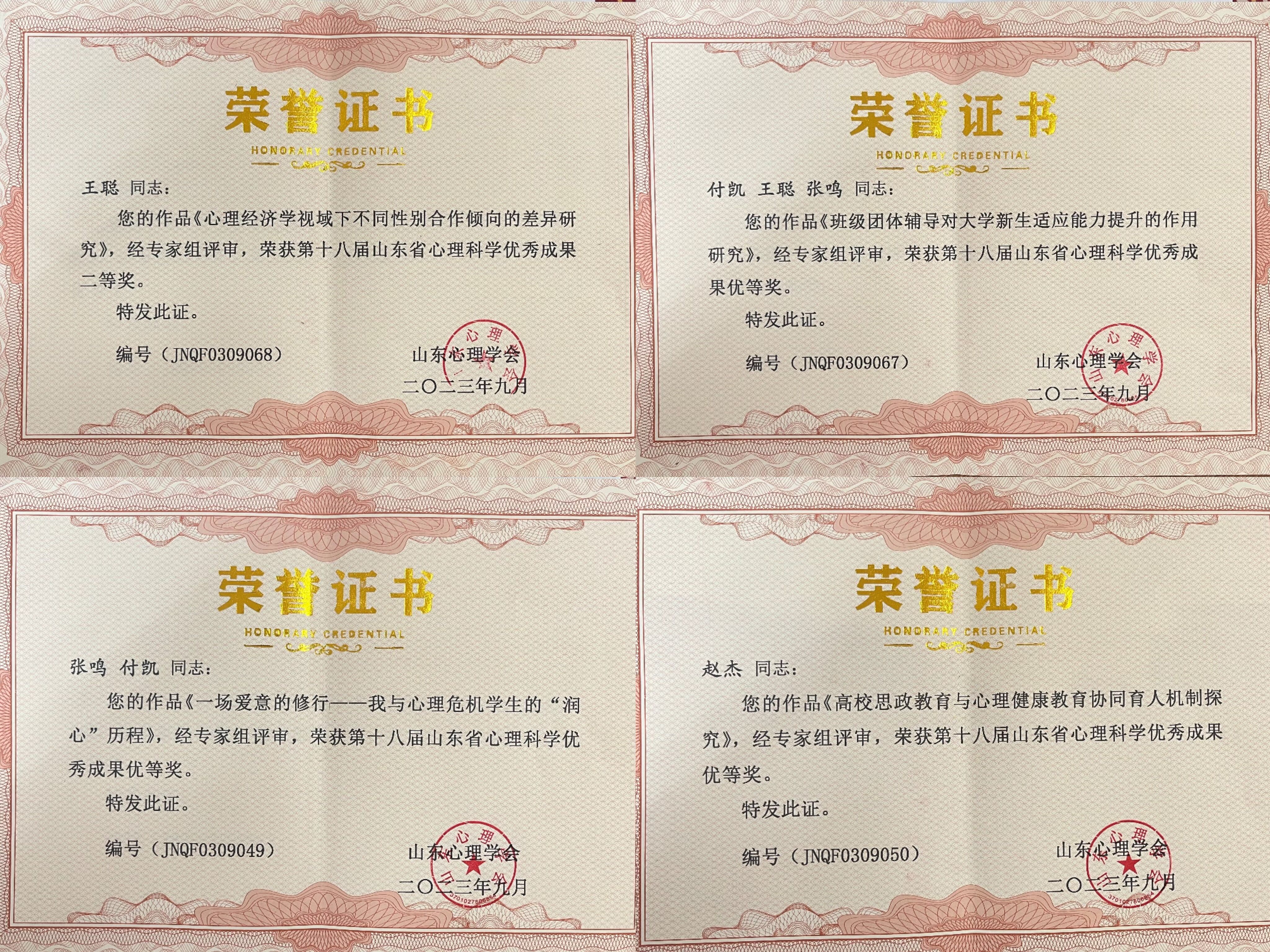 近日,山东心理学会2023年度学术会议于2023年9月16-17日在孔子故里曲阜召开,期间学会举行第十八届全省心理科学优秀成果评选活动,我院学工队伍积极参与,报送的作品获得奖励4项。