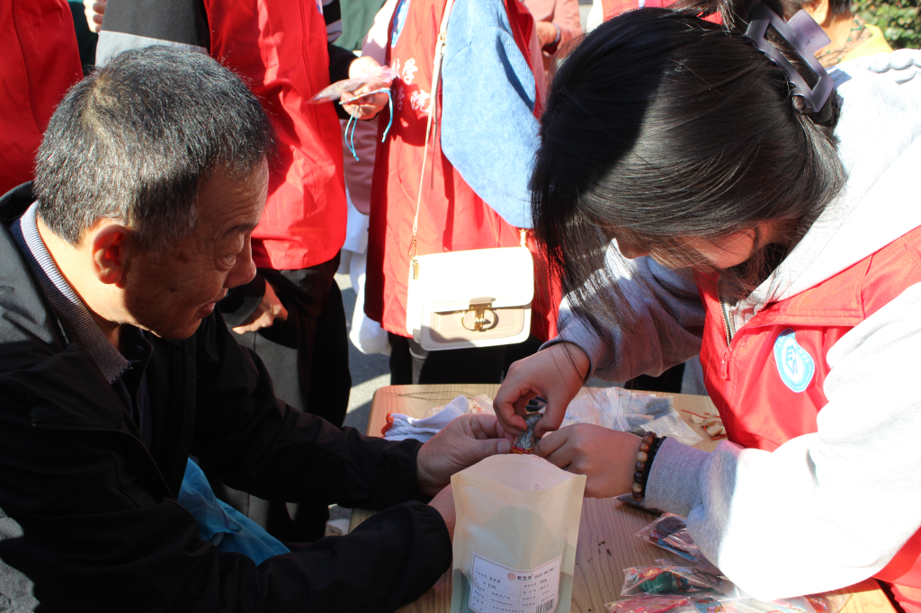 而重阳节在九月九日,“九”在民俗观念中是最大的数字,有长久长寿的含意,寄托着人们对老人健康长寿的祝福。香包活动处青年志愿者们列出纹饰各异的香囊手工包,请老人挑选喜欢的花纹,并与老人共同制作小香包。填香料,穿小金方“福”、圆“重阳”,拉系打结,小小香包在两代人手中愈发清香。