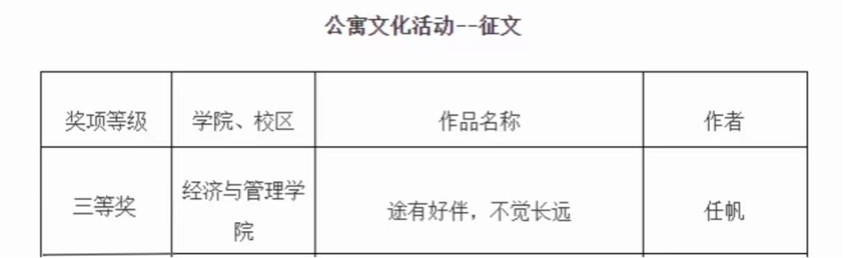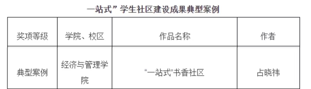 获评一站式”学生社区建设成果典型案例、公寓育人精品课二等奖、公寓文化征文活动三等奖、优秀组织奖。