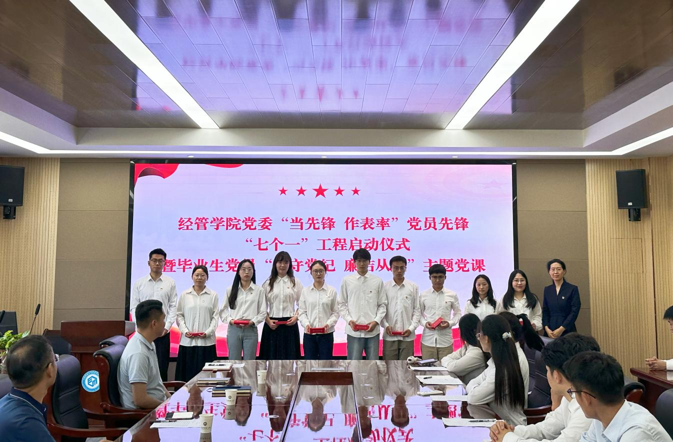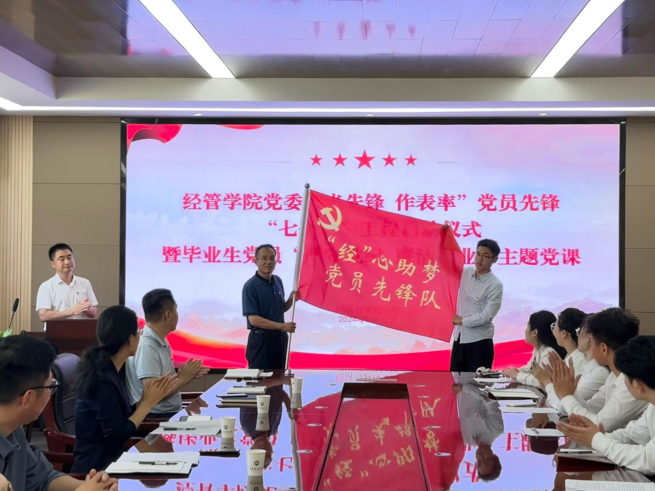 李勋来对结对帮扶工作表示肯定,并为“‘经’心助梦 党员先锋队”授旗,他强调“一个党员就是一面党旗,一面旗帜就是一个标杆”的理念,要以实际行动推动学院高质量发展。
