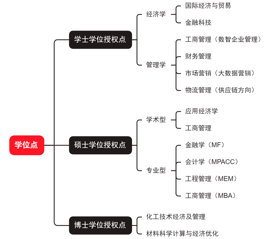 学院目前设有国际经济与贸易、工商管理(数智企业管理)、市场营销(大数据营销)、财务管理、物流管理(供应链方向)、金融科技6个本科专业,其中国际经济与贸易、工商管理、财务管理专业为国家一流本科专业建设点,工商管理专业为山东省品牌特色专业。企业管理为山东省重点学科,拥有化工技术经济及管理、材料科学计算与经济优化2个二级学科博士点,以及工商管理、应用经济学2个一级学科硕士点,工商管理专业硕士(MBA)、会计专业硕士(MPAcc)、工程管理专业硕士(MEM)、金融专业硕士(MF)4个专业学位硕士点。