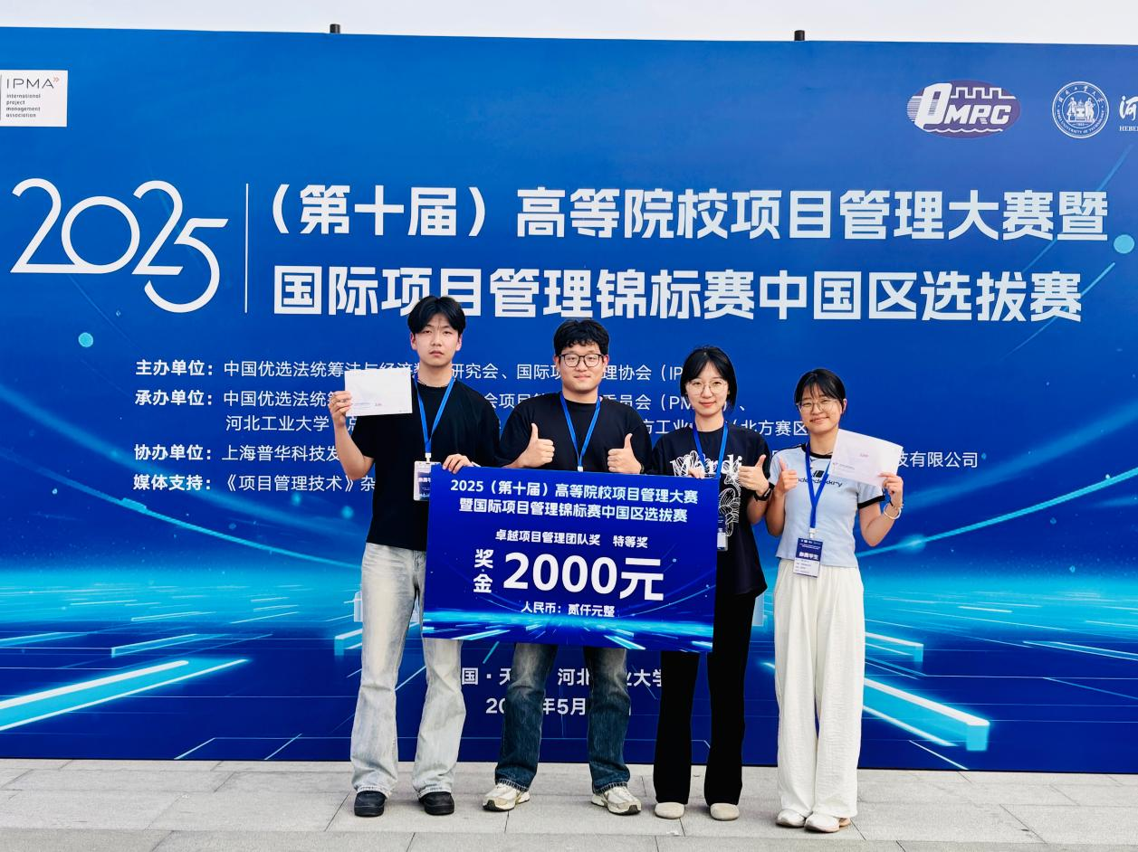 2025年5月25日,第十届全国高等院校项目管理大赛暨国际项目管理锦标赛中国区选拔赛在河北工业大学落下帷幕,我院学子斩获佳绩,再续荣光。全国本科生组共有5支队伍获团队特等奖,其中我院2支参赛团队全部获团队赛特等奖。