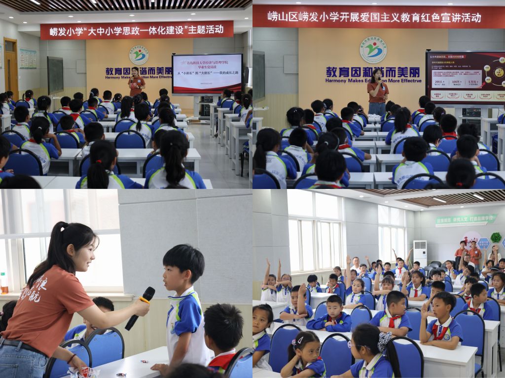 仪式结束后,暖心愿志愿团队立即开展首次志愿活动。在“大中小学思政一体化建设”主题活动中,团队成员化身红色宣讲员,以“从‘小班长’到‘大班长’的成长故事”为引,结合自身经历,用通俗易懂的语言向孩子们传递责任与担当。在“强国复兴有我:红色传承启新程”故事宣讲环节,志愿者们以亲历的乡村振兴实践为切入点,生动讲述扎根乡土助力产业发展、用青春力量服务国家战略的奋斗者故事。互动问答间,孩子们踊跃举手发言,现场气氛热烈。志愿者们用鲜活的案例与亲切的话语,将红色文化的种子播撒在孩子们心间,引导他们从小树立家国情怀,让强国复兴的理想信念在互动交流中悄然生根发芽。