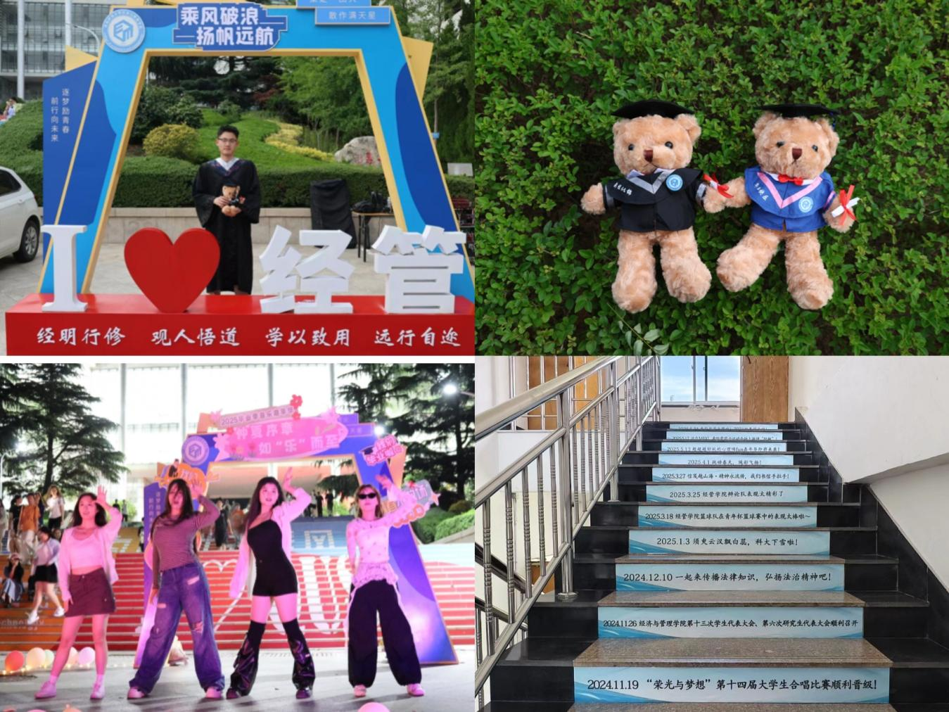 学院以美育浸润心灵,为毕业季注入温暖底色。“仲夏如歌 青春启航”音乐嘉年华中,毕业生用艺术语言诉说校园记忆与未来期许;学院精心设计的毕业纪念小熊,身着专属学士服,成为承载青春记忆的独特信物,为毕业生定格难忘瞬间;“青春印记”纪念楼梯贴以校园点滴与毕业寄语,在台阶间铺展代际相连的情感长廊。这些浸润着美育温度的创意表达与暖心设计,将青春故事凝刻成永不褪色的纪念。