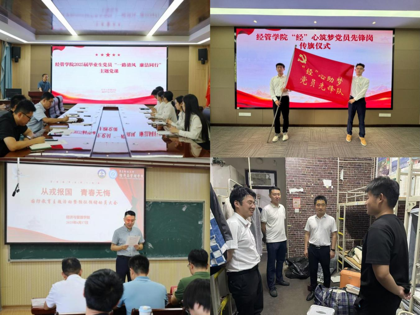 学院以德育铸魂,将思想政治教育贯穿毕业季始终。一方面,开展“一路清风 廉洁同行”专题党课,邀请省委党校专家结合典型案例剖析,引导毕业生党员以党纪为尺,扣好职业生涯“第一粒扣子”。另一方面,创新开展征兵宣传教育,邀请优秀退伍士兵分享军旅故事,结合政策解读,激发毕业生投身国防建设的热情。毕业季期间,学院领导走进学生宿舍,细致了解毕业生去向,传递温暖关怀的同时,以思想引领强化毕业生责任担当,为其未来发展注入精神动能,助力经管学子在时代浪潮中坚守初心、勇担使命。