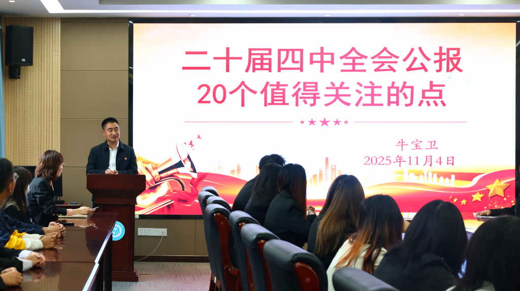 牛宝卫围绕党的二十届四中全会值得关注的二十个核心要点展开系统解读。他从党的二十届四中全会召开的时代背景、重大意义切入,结合经管学科特色,重点阐释了“我国经济长期向好”“坚持把发展经济的着力点放在实体经济上”等与学院发展紧密相关的战略部署,强调要深刻把握“战略机遇和风险挑战并存”的发展环境,将个人成长与国家战略需求紧密结合。会议强调,要将学习贯彻党的二十届四中全会精神作为当前和今后一个时期的重要政治任务,自觉把思想和行动统一到党中央决策部署上来,不断增强“四个意识”、坚定“四个自信”、做到“两个维护”,切实提高政治判断力、政治领悟力、政治执行力。