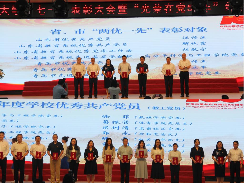 “七一”表彰大会暨“光荣在党50年”纪念章颁发仪式于崂山区第二报告厅隆重召开。校领导,院级党组织书记、副书记,党支部书记代表,党员代表参与会议。