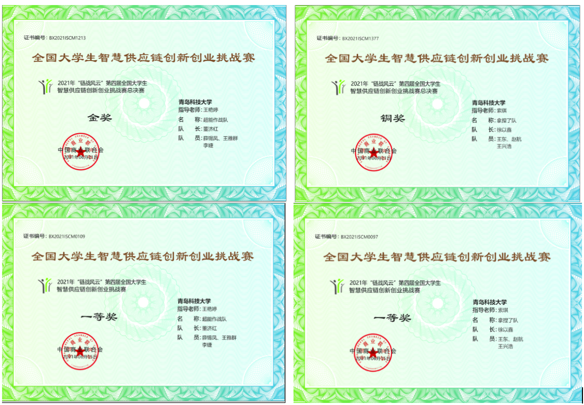 物流管理2019级两支参赛队伍在本次比赛中均荣获国家级奖项。其中,由王艳婷老师指导,学生董济红、薛锡凤、王雅群、李婕组成的“超能作战队”在初赛获得全国一等奖,决赛中荣获金奖,由索琪老师指导,学生徐以鑫、王东、赵航、王兴浩组成的“拿捏了队”在初赛获得全国一等奖,决赛中荣获铜奖。