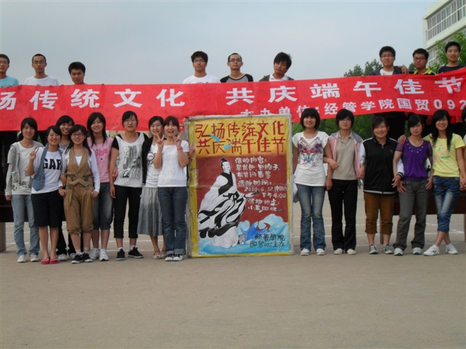 农历五月初五是我国的传统节日——端午节。值此佳节到来之际,国际经济与贸易系于2010年6月12日下午在四方校区五四广场举办了以“保护文化遗产,守卫精神家园”为主题的传统文化节,旨在弘扬传统文化,提高大学生传统文化修养。