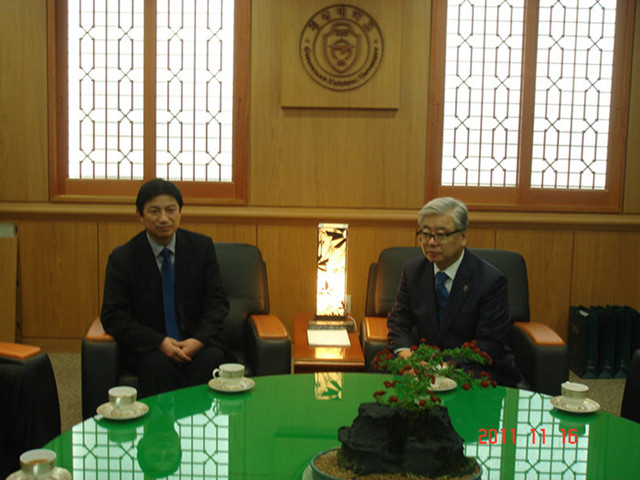 11月16日,代表团访问了国立庆尚大学校。庆尚大学校总长河友松在接见代表团时,回忆了两校多年来的合作关系,表达了对两校继续深化各层次合作与交流的强烈愿望,并表示希望两校能在交换学生、教授互访等领域深入合作。张志耀教授和崔铁岩副教授还在此参加了中韩大学国际学术会议,张志耀、崔铁岩在会上做了主题发言,得到了与会者的好评。会后庆尚大学河友松总长亲切接见了李利一行,河友松总长介绍了学校为建立国际化大学正在建设和将来的规划。