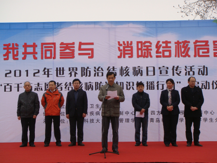 师生积极参与到此次活动中来。随后刘居庆局长介绍了四方区历年来的结核病预防与防治工作,并动员在场师生积极进行结核病防治知识及政策的宣传。讲话完毕,各位领导便在主题横幅上签字。随后现场观众亦踊跃参加现场的签名活动。最后,启动仪式进入互动环节,志愿者报名、现场知识竞答、现场咨询,同学们纷纷积极参加,场面十分热烈。