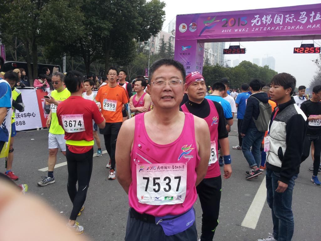 此次无锡国际马拉松赛全程共有42公里,要求在6小时内跑完。参加此次 马拉松赛的共有7000多人,其中50岁以上的有952人。跑完全程的有4000多人。而刘老师今年已年过五旬,却依旧保持年轻的心态,去挑战生活,挑战自己。在跑之前刘老师就给自己定了一个目标——五小时之内跑完。令人惊喜的是,他最终的成绩是4小时19分23秒,第3877名。