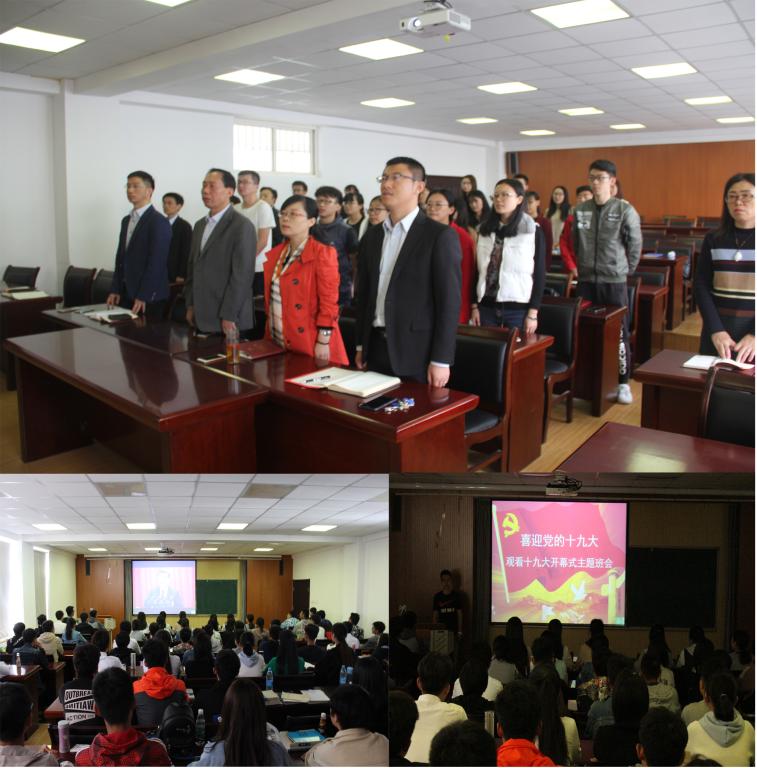 领导班子成员、全体师生党员在学院419会议室共同观看了党的十九大开幕会的现场直播。同时,学院学生党员、学生干部以及广大青年学生自发组织,通过中央电视台等主流媒体收听收看了直播盛况。当晚,学院在弘毅楼E-106、504和505会议室召开十九大主题班会,组织2017级新生观看了党的十九大开幕会回放。观看过程中,同学们全神贯注,不时报以热烈的掌声。经过此次主题班会,同学们亲身体会到了党和国家的飞速发展,进一步坚定了为中国特色社会主义事业贡献光和热的信念。