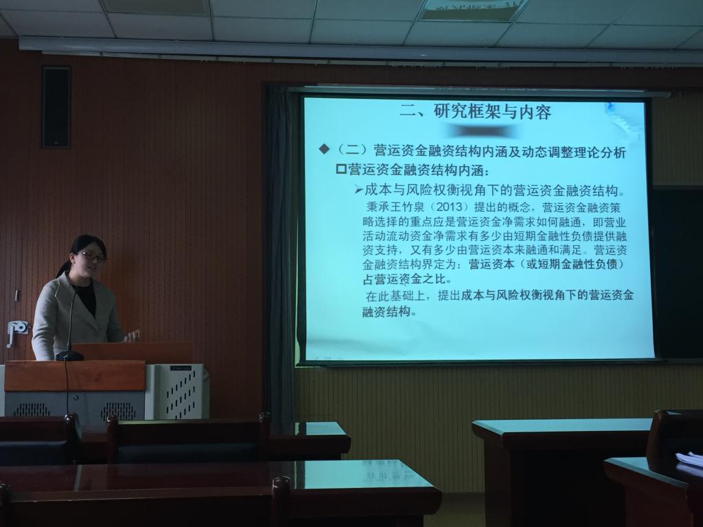 随后,教师代表孙兰兰与大家分享了题为《企业营运资金融资结构的影响因素与动态调整研究》的博士论文。她详细介绍营运资金融资结构动态调整问题研究的重要意义,从微观、中观和宏观三个层面对营运资金融资结构的影响因素进行系统全面的理论分析和实证检验,引起同学们对营运资金融资架构的强烈关注。