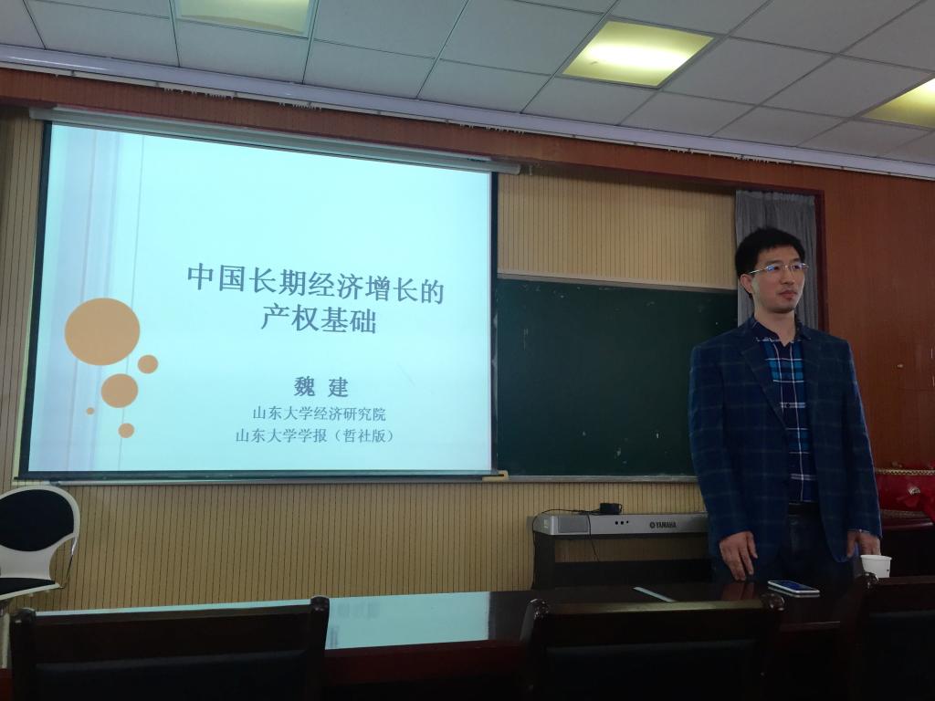 讲座开始前,首先由杨友才教授就魏建的个人简历向全体师生做了简要介绍,魏建教授是法经济学领域的领军人物,教育部新世纪人才,在《中国社会科学》、《经济研究》、《管理世界》等高水平一流杂志发表文章四十余篇。接着,魏建教授做了题为《中国长期经济增长的产权基础》的专题报告,报告围绕中国近40年经济增长的基本事实、中国产权改革与保护促进经济增长的历程、产权保护和改革的中国经验、理论分析和国际比较四方面展开讲解。他提出的“产权问题始终是核心问题,产权改革始终是改革的关键”、“公有制是我国的特殊所在”等观点引起大家的强烈共鸣。讲座引起大家热烈讨论和踊跃提问,魏建教授对师生提出的问题进行了详细解答,使同学们受益匪浅。