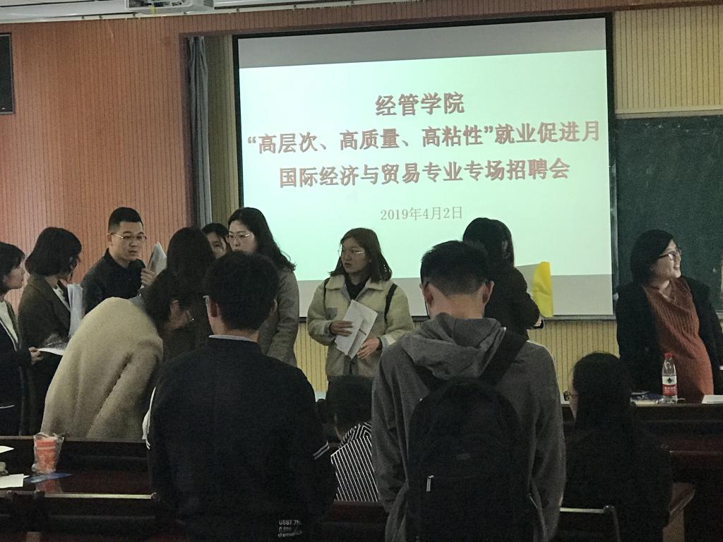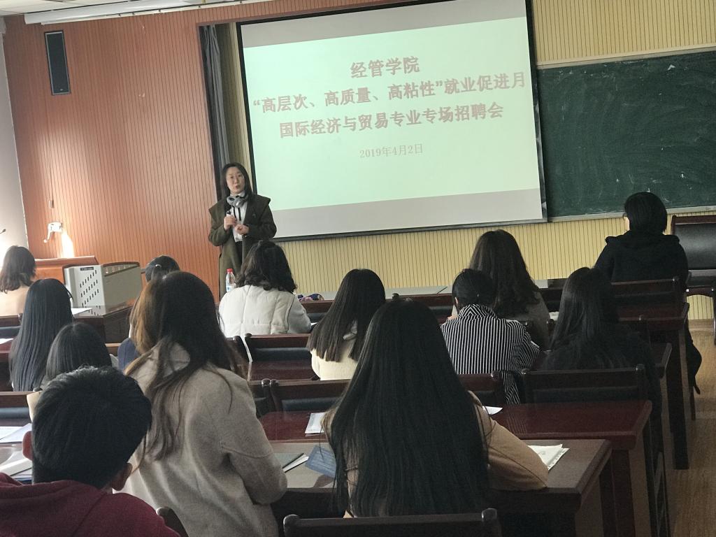 为进一步提高毕业生求职技巧,搭建就业求职新平台,不断实现毕业生更高质量和更充分就业,结合学科特点和学生实际情况,国际经济与贸易专业于4月2日在经管楼419教室成功举办专场招聘会,崂山校区和高密校区国际经济与贸易专业毕业生参加了本次招聘会。