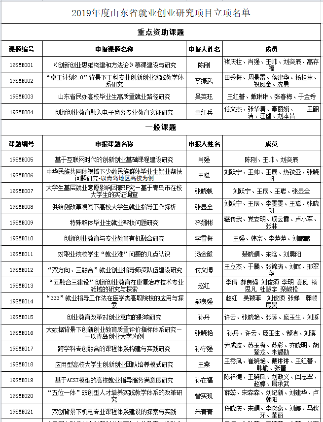 为全面贯彻习近平新时代中国特色社会主义思想和党的十九大精神,全面贯彻全国教育大会精神,突出加强就业创业理论研究的前瞻性、应用性和实践性,进一步提升就业创业工作水平,山东省社会科学基金委员会于2019年2月组织启动2019年山东省就业创业研究项目申报工作。近日,经专家评审,最终确定山东省就业创业研究项目立项40项,重点资助课题4项。成人直播平台