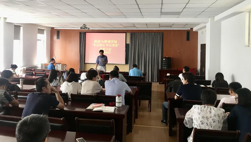 于经管楼419召开“不忘初心、牢记使命”主题教育工作会议,安排部署主题教育工作,学院全体教师党员参加会议,会议由党总支书记李德成主持。