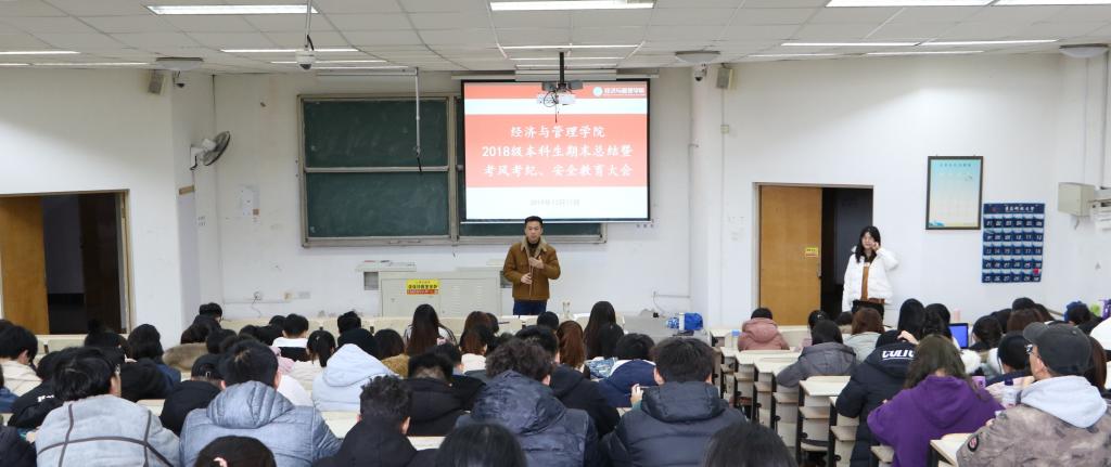 2018级本科生于弘毅楼E202室分专业召开期末总结暨安全教育、考风考纪大会。本次大会由18级辅导员高守朋老师主持,18级全体学生参加。