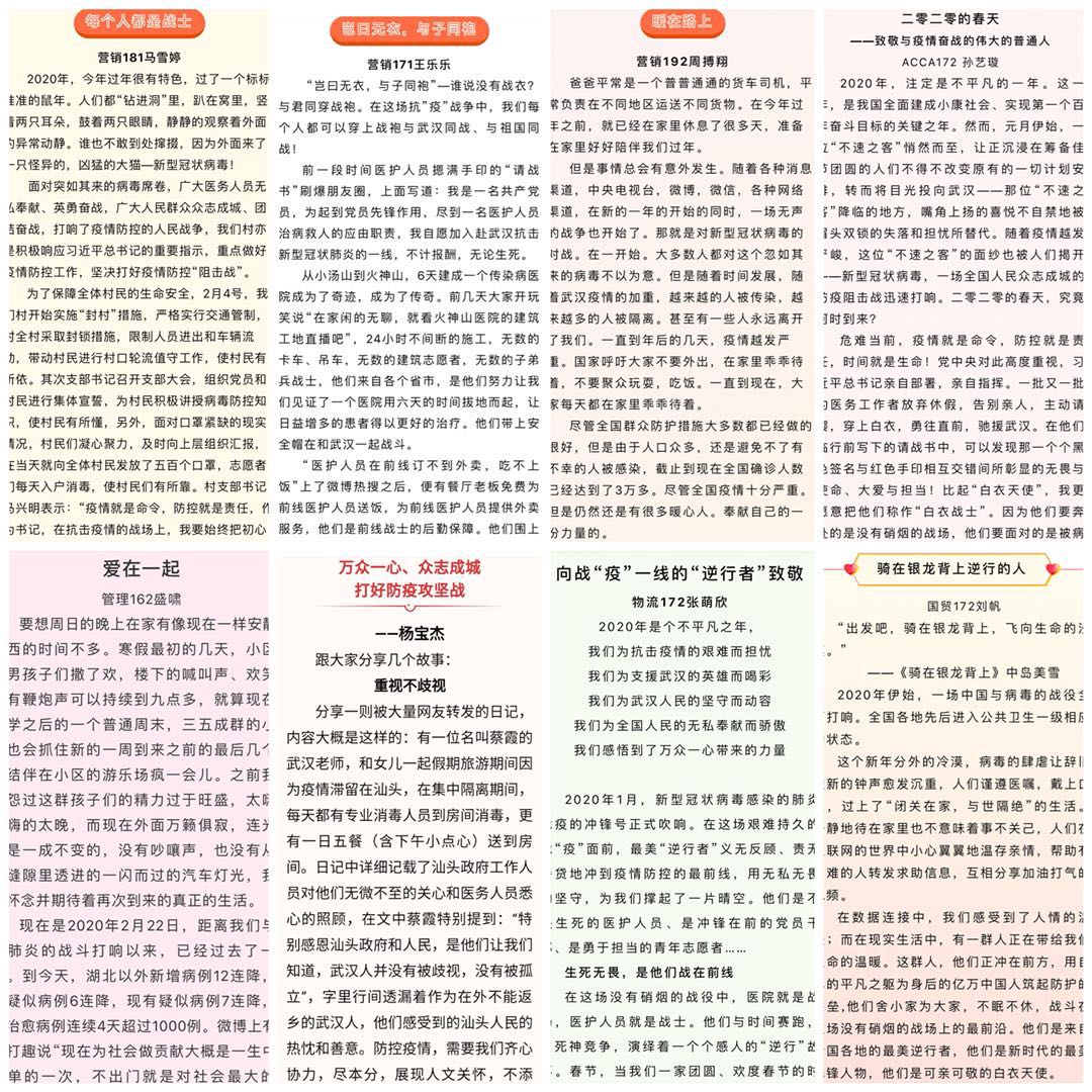 举办“我身边的战‘疫’故事”、“党旗红,众志城——防控阻击,我们‘战’在‘疫’起”作品征集活动,截止目前共收到168篇文稿,鼓励青年学子通过文字弘扬青春能量,抒写爱国情怀,畅谈作为学生党员对此次疫情的所感、所得,讲述身边军民携手、团结一致抗疫防疫的动人事迹,讴歌逆流而上、奋战在疫情救治、防控第一线的医生、护士、军人,科学家、志愿者、社区工作者等新时代英雄。