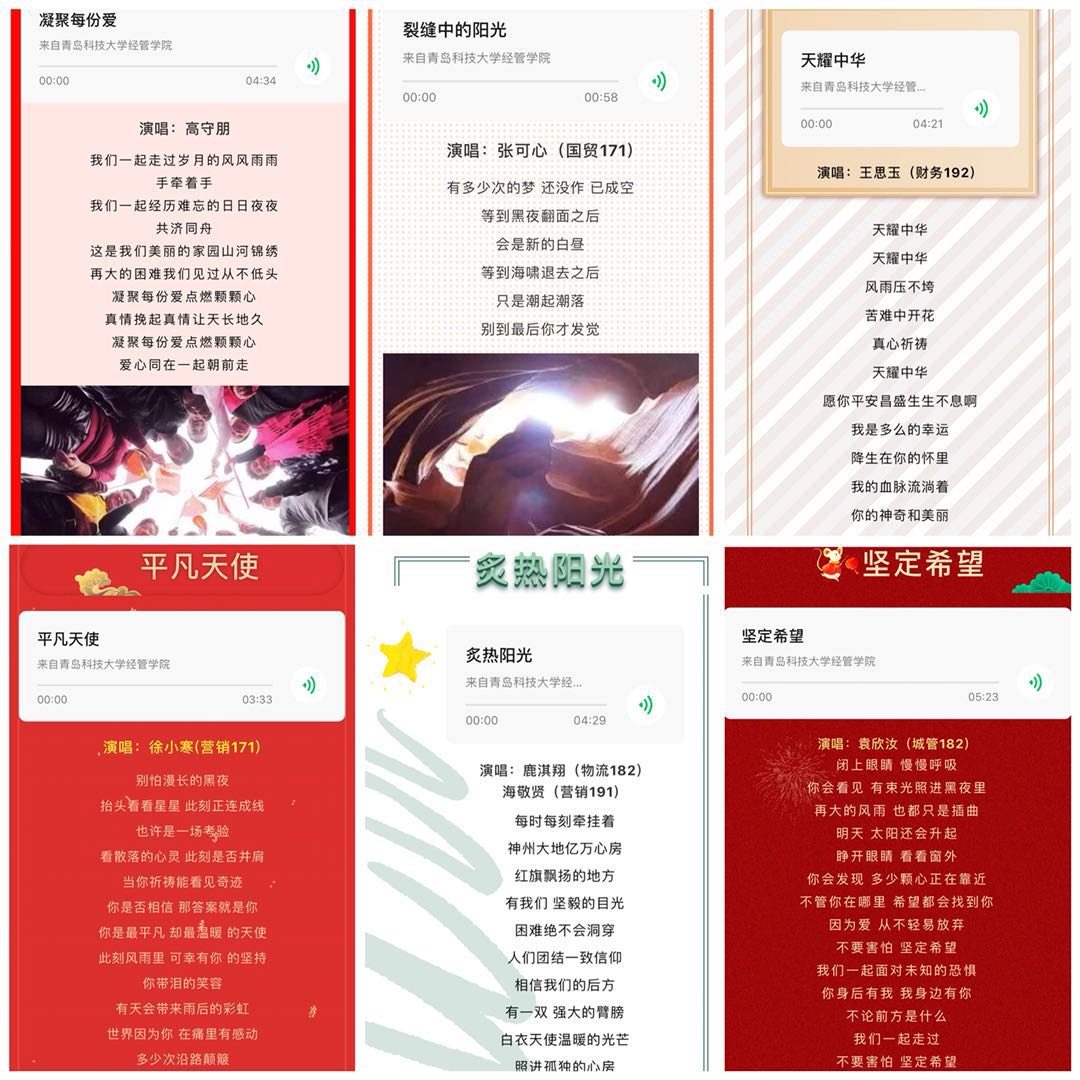 组织开展“以‘经’心之歌 传战‘疫’之情”活动,教师代表和教师代表和青年学生们通过歌曲录制的形式助力疫情防控宣传工作。其中,18级辅导员高守朋老师歌唱《凝聚每份爱》,致敬可爱的逆行者们,歌颂了他们义无反顾、连夜奋战的崇高精神;物流182班鹿淇翔和营销191班海敬贤合唱《炙热阳光》,用歌声传达了全国人民上下一致抗击疫情的决心,倡导青年学子应时刻不忘初心,牢记力重千钧的使命担当。此外,还有国贸171张可心、财务192王思玉等26名同学,共同为战“疫”献声,以音传情。