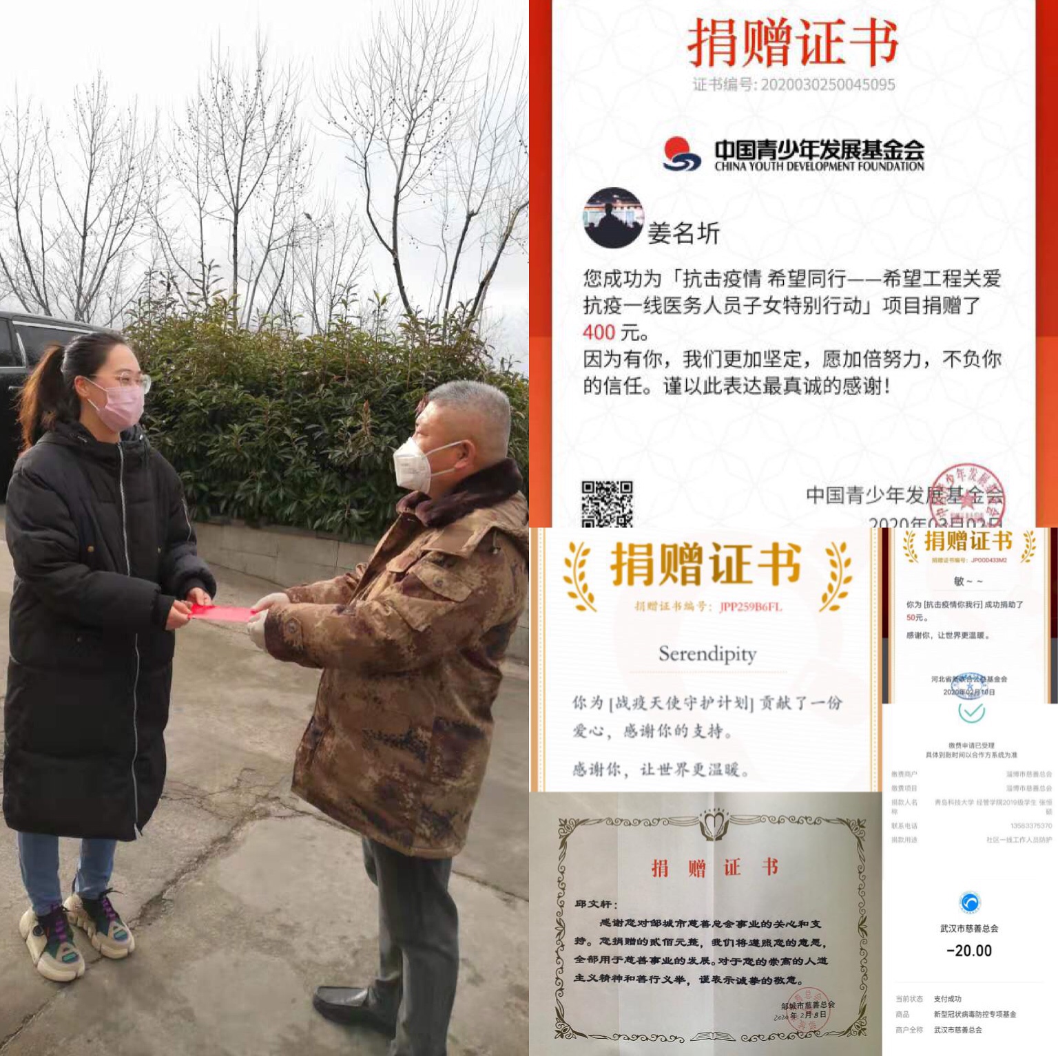 在这场战役中,人人都是参与者,人人都是见证者。财务管理(3+4)161班曲飞、财务181班邱文轩、营销162班韩苗苗、财务192班王心雨、营销192班阚晓敏、ACCA192班张恒硕等同学纷纷通过官方渠道积极参与到疫情防控捐款活动中,为抗击疫情贡献爱心。其中,担任成人直播平台