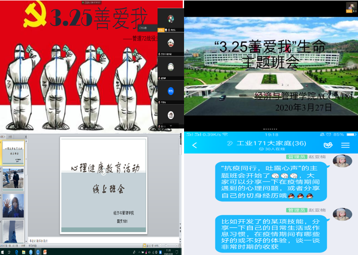 ACCA181班、管理172班等多个班级组织了线上心理健康教育主题班会。同学们分享了自己在疫情期间的心理感受和一些有效缓解心理压力的方法,大家一起探讨,共同交流、共同成长。工业171班张翔宇同学说道:“疫情期间,足不出户的时候感觉有点无聊,有时候会感到很烦躁,但是心理压力并不大。杨一帆同学则发出了“武汉加油,中国加油,世界加油!”的信心宣言。