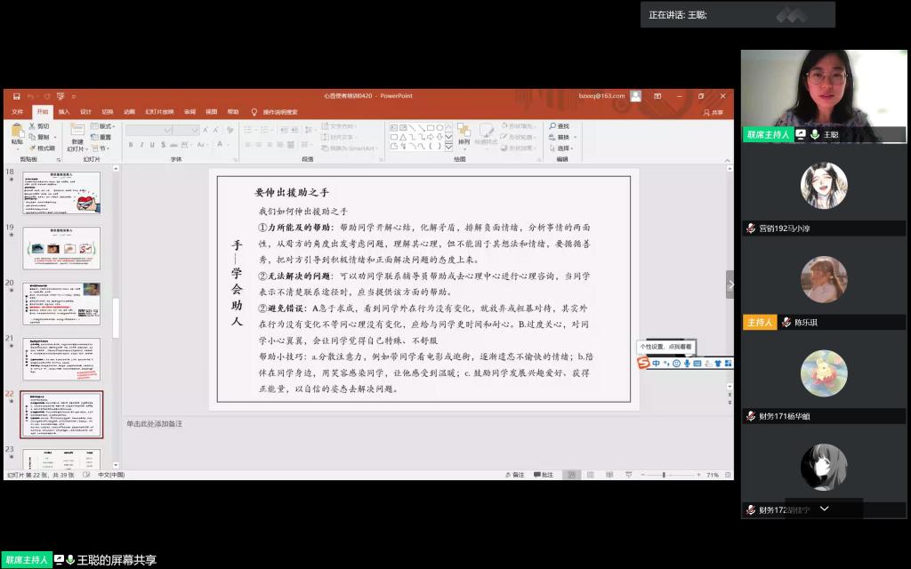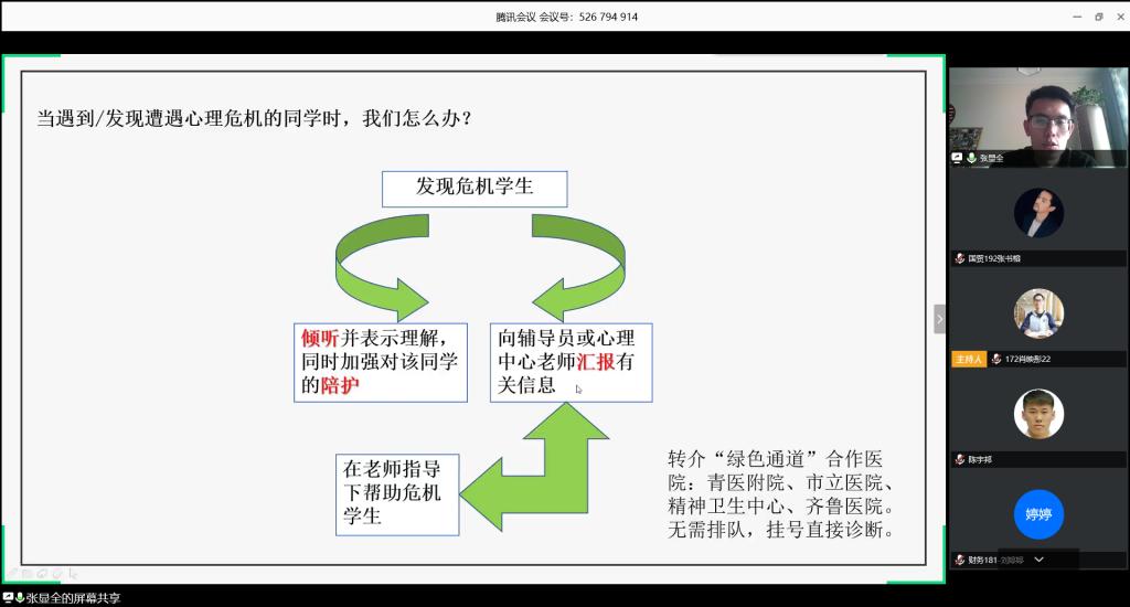 借助腾讯会议平台举办“心音使者”线上培训会,学院心理工作站王聪、张显全担任主讲老师,2016级、2017级、2018级共计285名“心音使者”参加了培训。