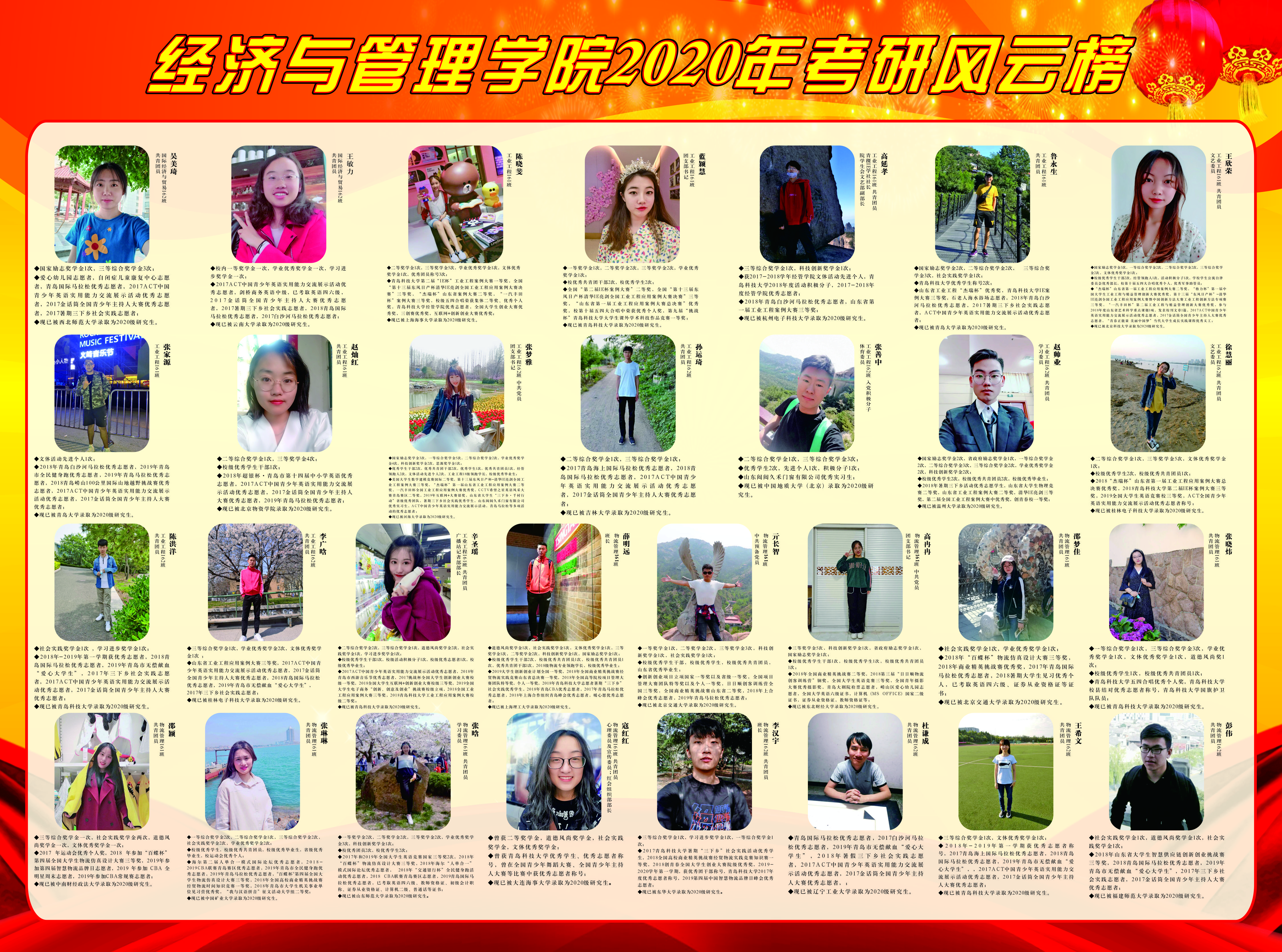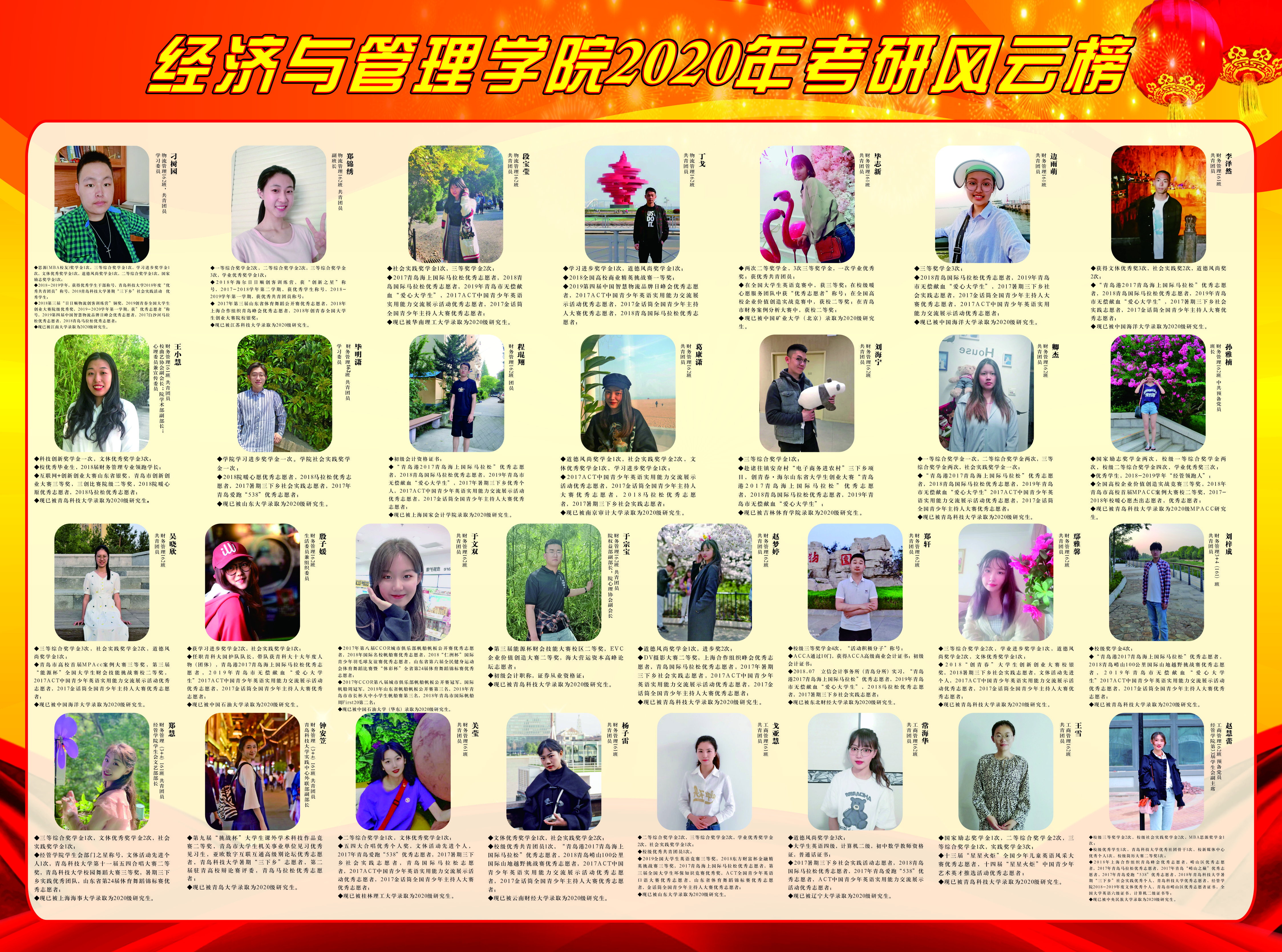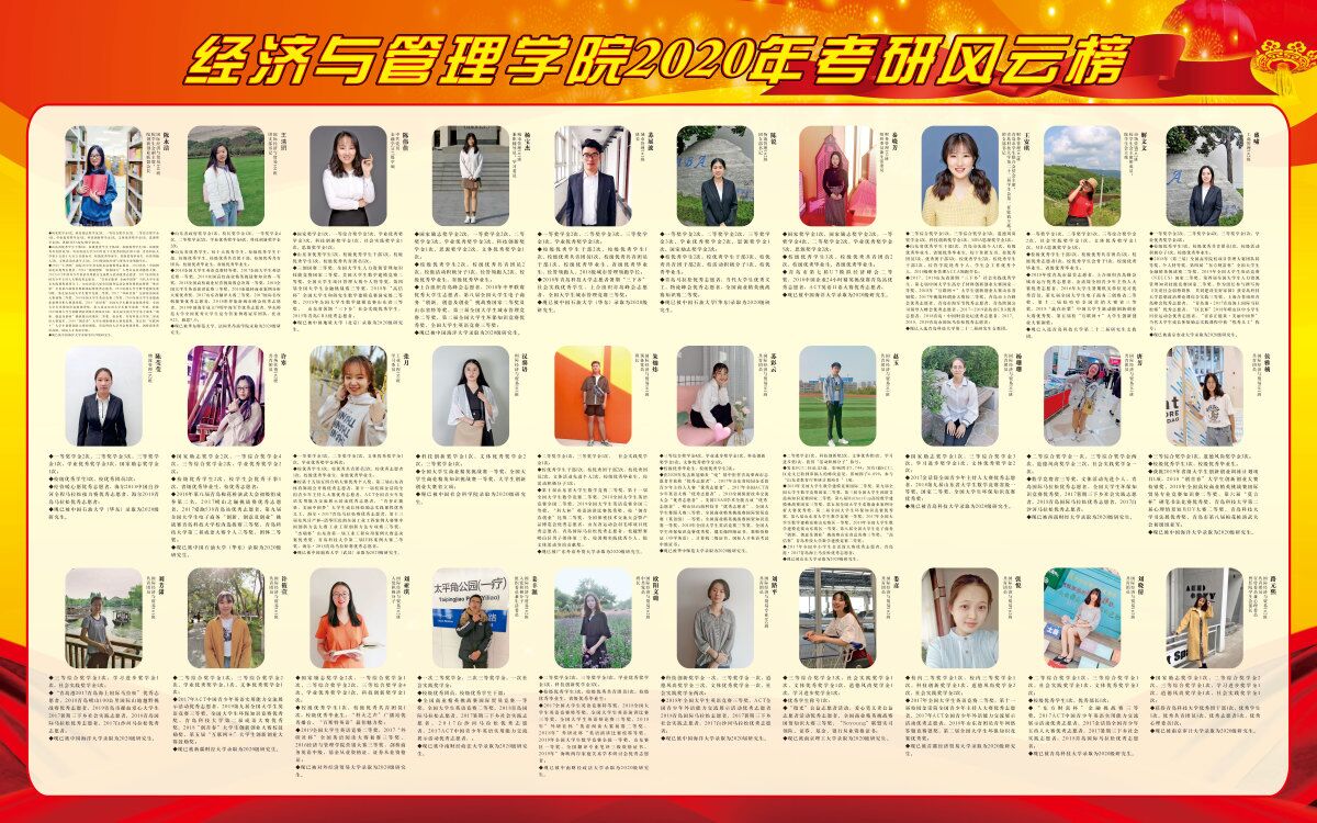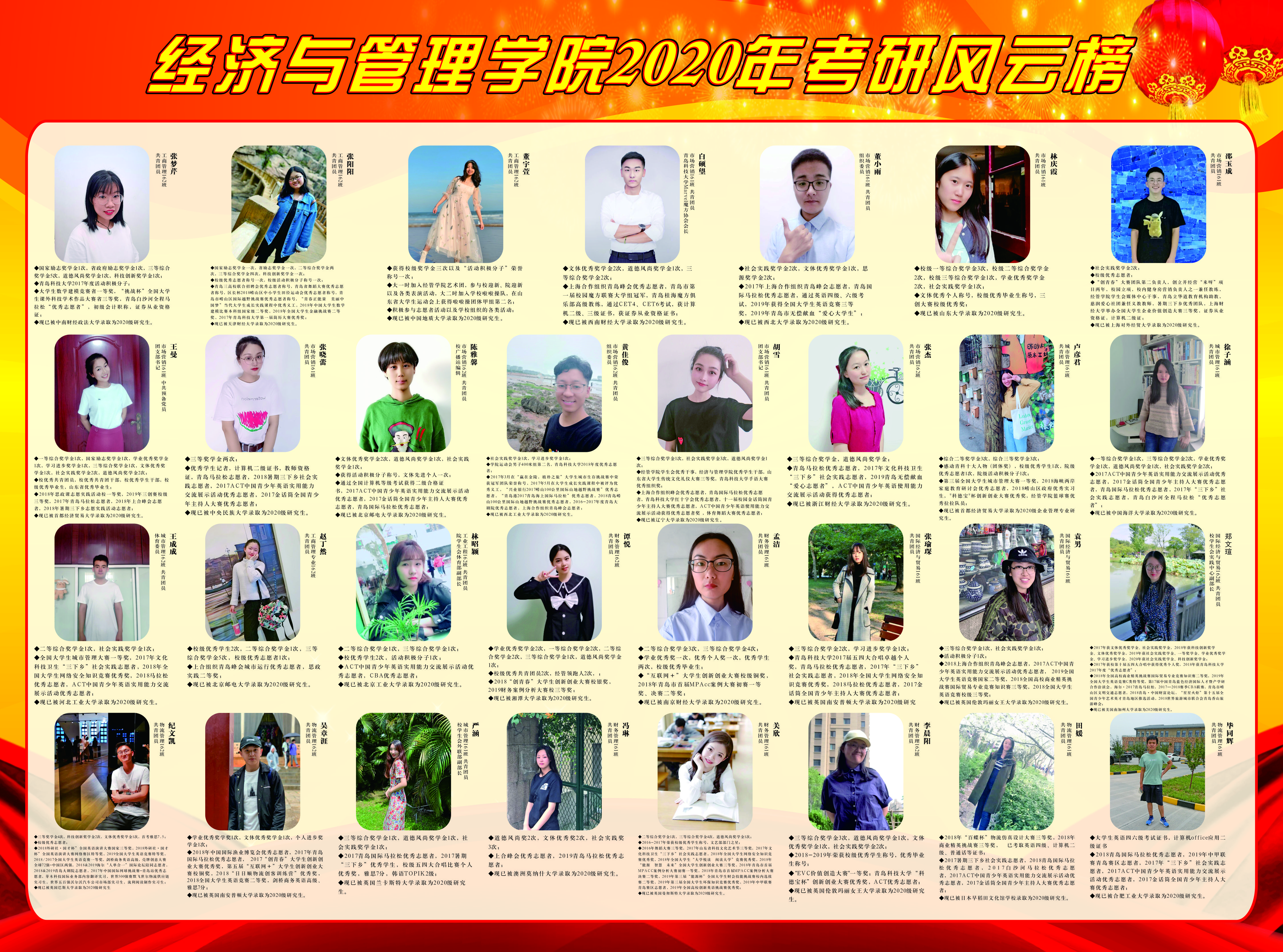 日前,2020年全国硕士研究生招生录取工作落下帷幕,我院考研喜报频频传来,在全体师生的共同努力下,我院的考研工作较之以往又上新台阶。据统计,国内外升学最终录取人数122人,双一流高校录取人数58人,总考研率达24.94%,较去年提升近5个百分点。其中,国际经济与贸易专业考研率37.5%,工商管理专业考研率14.71%,财务管理专业考研率23.97%,工业工程专业考研率30.51%,城市管理专业考研率10.34%,市场营销专业考研率19.35%,物流管理专业考研率40.35%。为进一步夯实学院学风建设,树榜样,立标杆,营造浓厚学术氛围,特推出“考研风云榜”展示活动,具体如下: